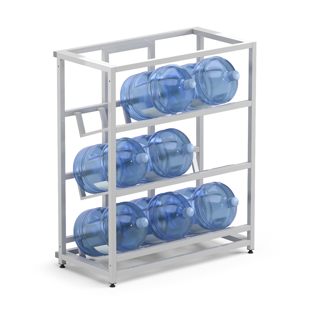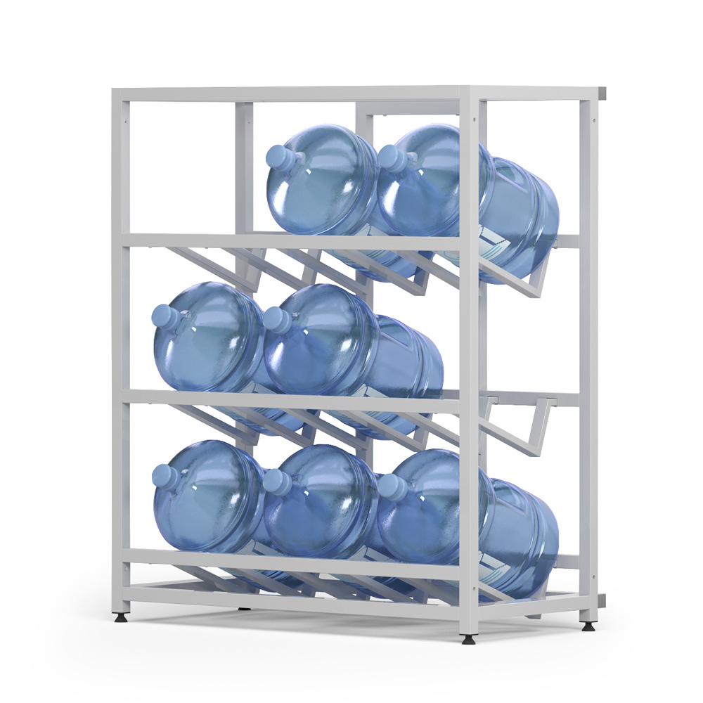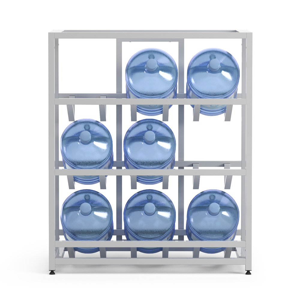 Идеальное решение для тех, кому не нужен гигантский склад, но хочется держать запас воды аккуратно расставленным. Три полки, девять бутылей — всё под контролем.