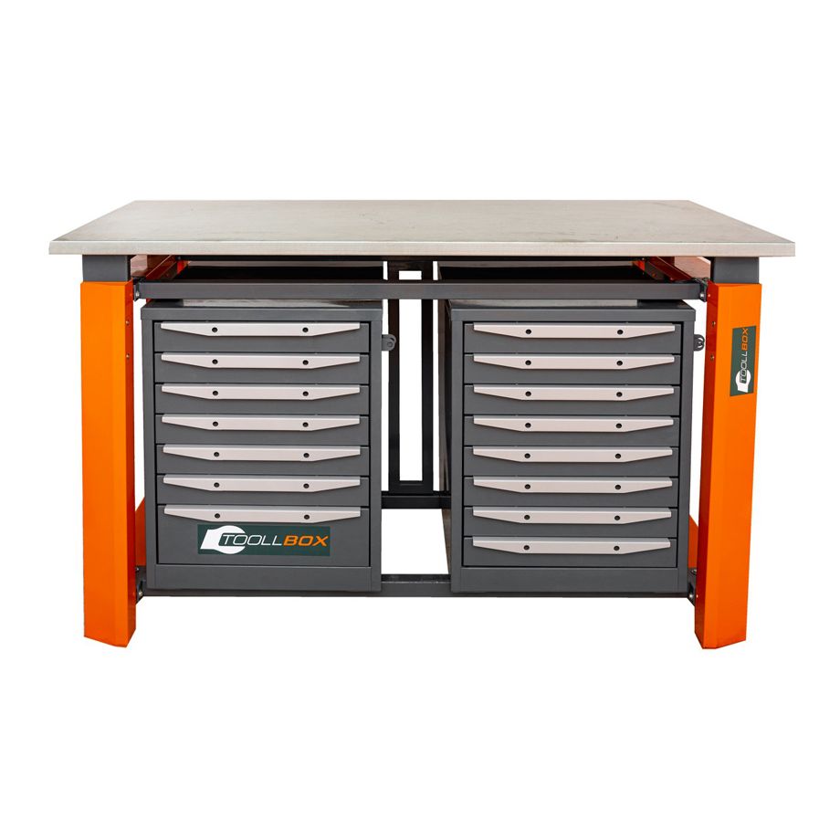 Комплектация модели включает одну тумбу с 7 ящиками и одну тумбу с 8 ящиками. Такая конфигурация особенно удобна для тех, кто ценит четкое разделение инструмента по категориям и хочет поддерживать порядок без дополнительных шкафов и приставных модулей.